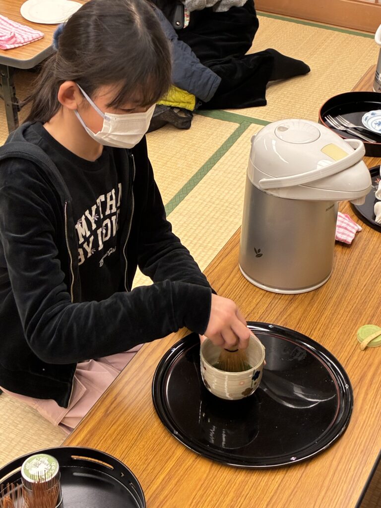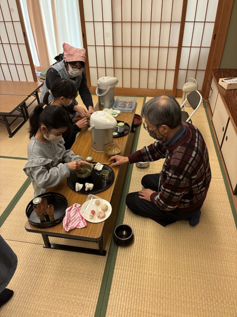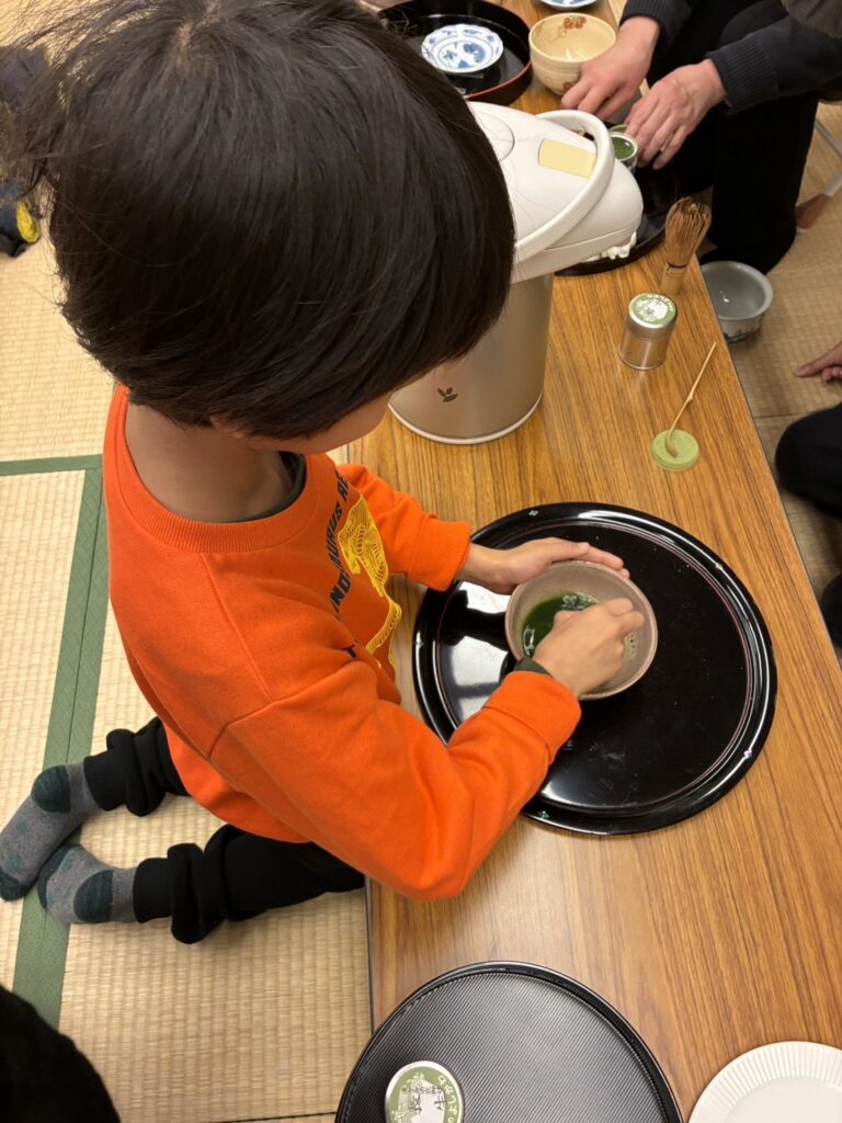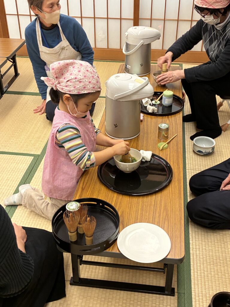 初めてお抹茶を口にする子どもがほとんどだったと思われますが、甘い練りきりの助けを借りて挑戦してました。